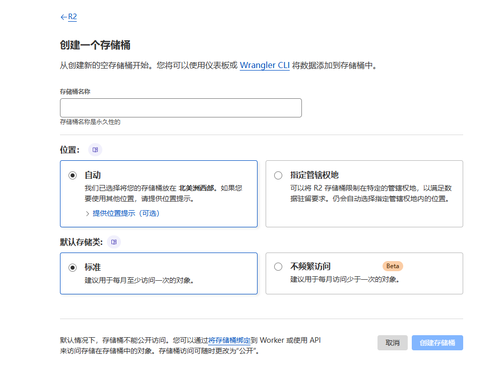 点击 ”将R2订阅添加到我的账户“,然后在这个页面,点击创建存储桶。存储桶的名称,自己定义一个就行。然后位置这里,可以根据自己网站的,主要用户所在的地区,来就近选择。