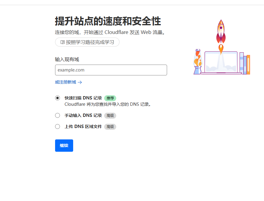 要实现自定义域名,我们需要先把自己的域名,托管到 Cloudflare 才行。在 Cloudflare 的左侧导航栏,点击网站选项。然后在现有域这里,填上我们自己的域名。