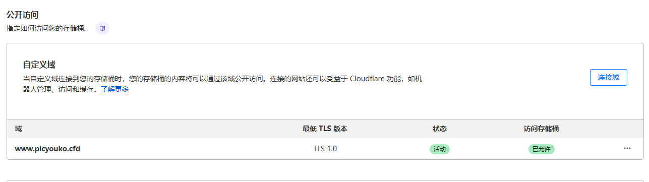 现在域名已经托管到 Cloudflare 了,接下来我们用这个域名,替换 Cloudflare R2 分配的域名。打开我们创建的存储桶,点击右侧的设置选项。向下划,找到自定义域,点击连接域,然后输入我们的域名就可以了。等一段时间刷新页面,就可以看到自定义域名已经生效了。