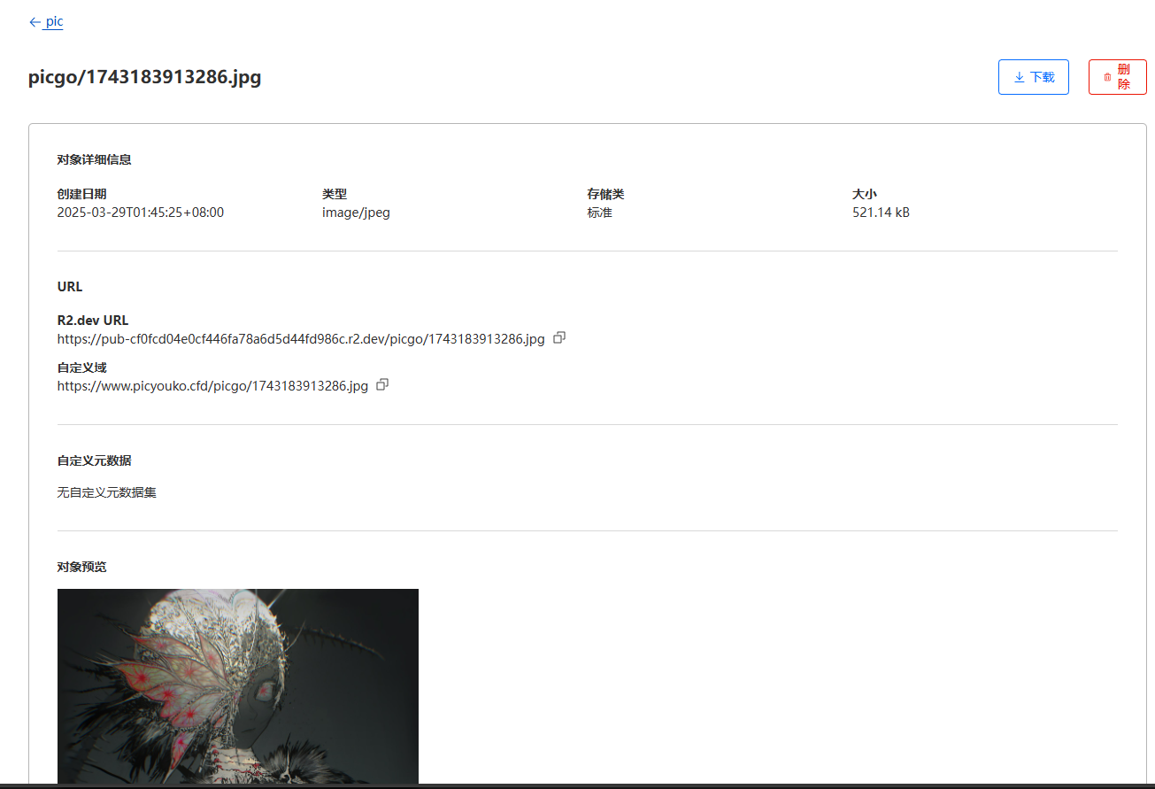 然后我们再打开 blog 存储桶中的图片,可以看到除了原来的那个网址,还给我们生成了一个自定义域名的网址,这2个网址都可以用来访问图片。